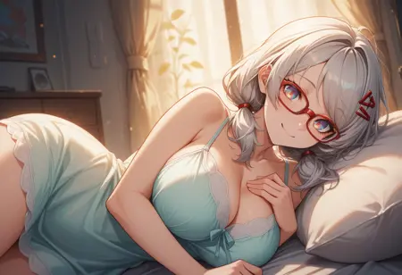 キャラクター: 灰色の髪、ミディアムヘア、低いツインテール、大きな胸、赤枠の眼鏡、髪留め、メガネ、流れた前髪、複色の目