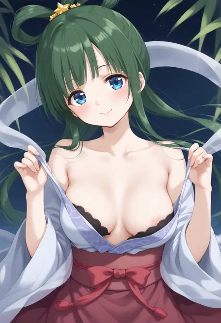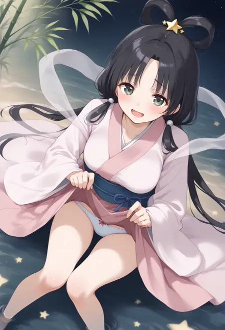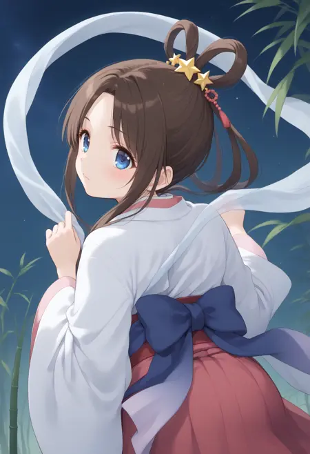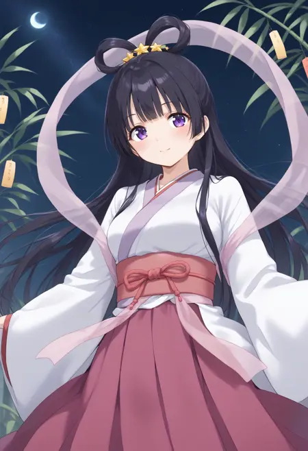 仅使用触发词可能不稳定,请从以下元素中添加所需内容:发环、发饰、披肩、和服、七夕、羽衣、长袖、宽袖、腰带、kimono、星星(天空)、夜晚、竹子、短笺。