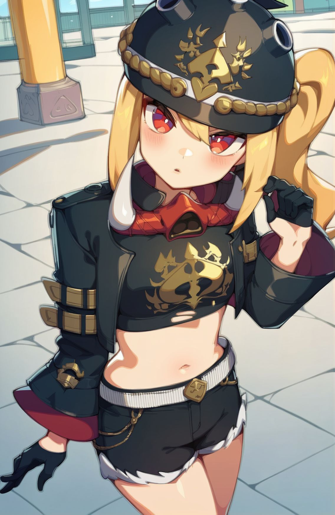 Recommended positive tags: black headwear, blonde hair, crop top, hat, helmet, long hair, midriff, navel, red eyes, black shorts, spade \(shape\), leather jacket, gloves, side ponytail,