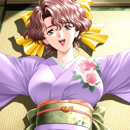 Shingyouji_Reiko(Doukyuusei), 1girl, solo, large breasts, brown hair, short hair, wavy hair, mature female, Yellow ribbon, hair bow, brown eyes, parted bangs,