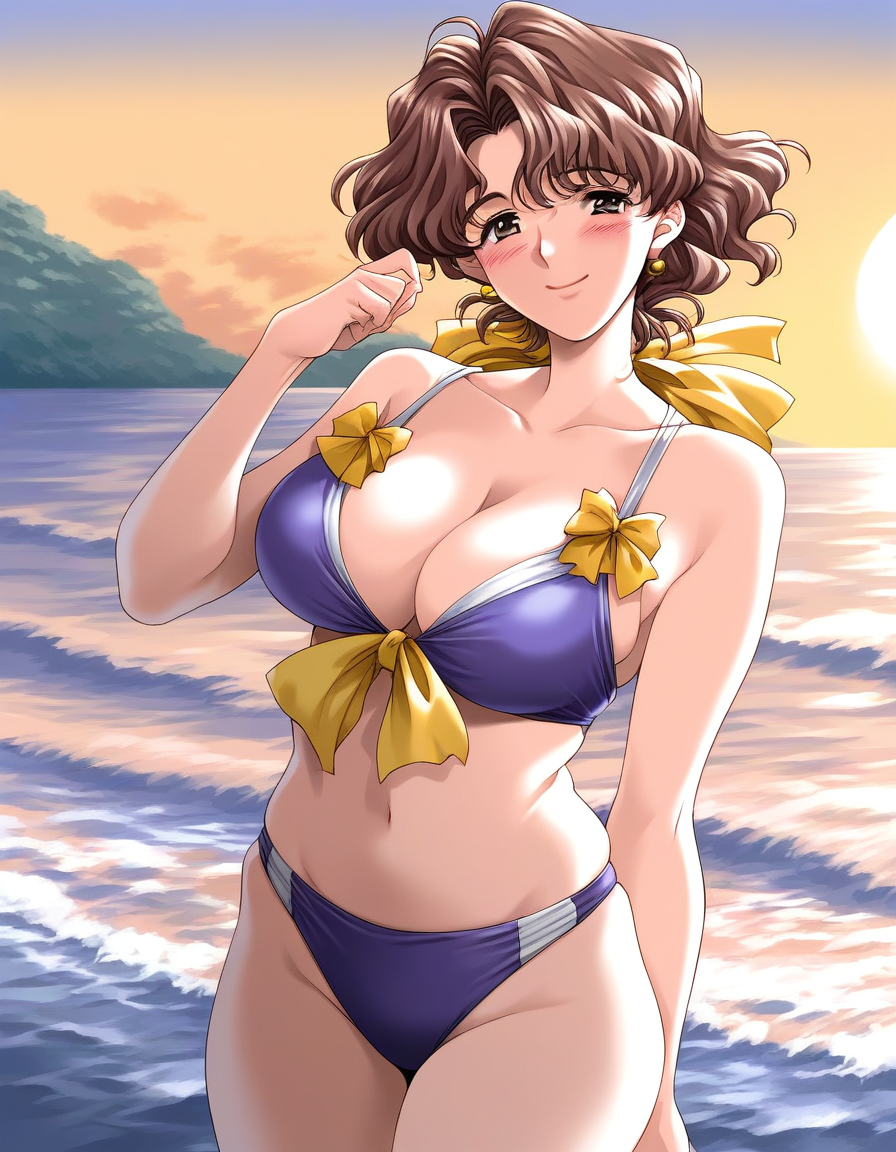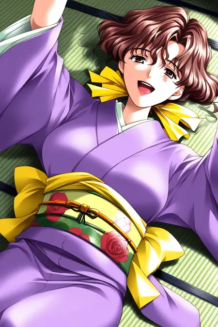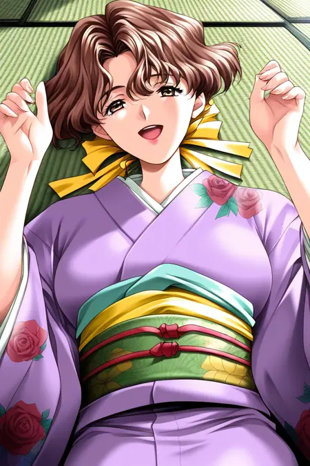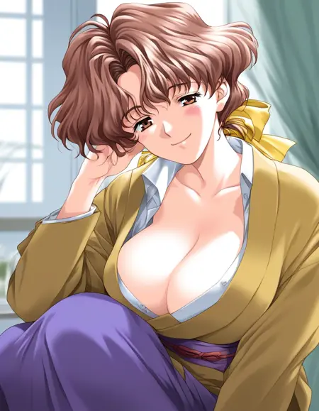 Shingyouji_Reiko(Doukyuusei), 1girl, solo, large breasts, brown hair, short hair, wavy hair, mature female, Yellow ribbon, hair bow, brown eyes, parted bangs,