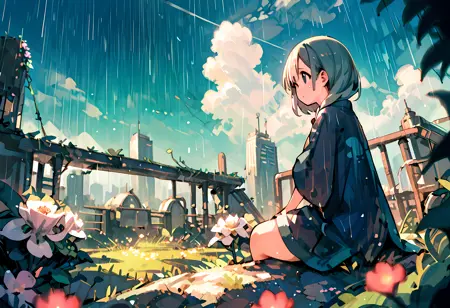 - 其他包含在描述中的标签有:(grass, flora, water, wet, wires, pipes, telephone sign, spear, rain, worms, waterfall, stalactites, blurry foreground, holding flag, monochrome, closed eyes 等)。
