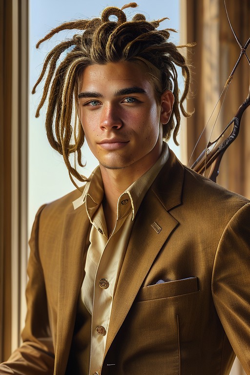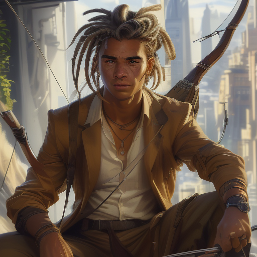 来自《愿望:未来战斗理发师》的Armani DaArcher。恐惧之发弓箭手。一位19岁的英俊南美白人男性弓箭手,榛色眼睛,短款浅棕色脏辫,手持弓箭,站在未来摩天大楼顶端,神情胆怯,写实风格,晒伤,英俊,穿着像住在森林里的人,但仍时尚而英俊