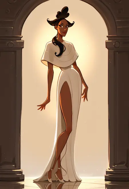 clio, brown eyes, black hair, ponytail over shoulder, white capelet, white chiton dress, side slit, white high heels, dark red lipstick, dark red eyeshadow