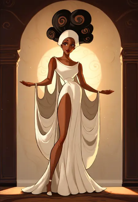 terpsichore, brown eyes, black hair, white frilled crop top, white skirt with train, white arm drapes, white high heels, dark red lipstick, dark red eyeshadow