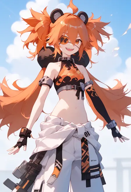 - fingerless gloves,armlet,belt,metal collar,armlet,jacket around waist,orange midriff,white pants,single elbow glove,