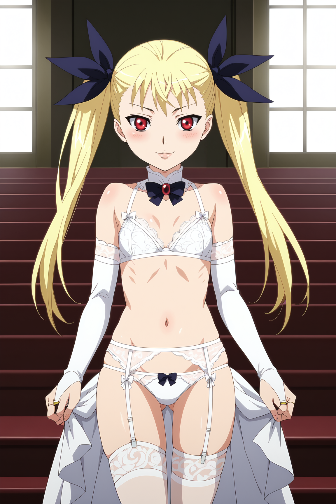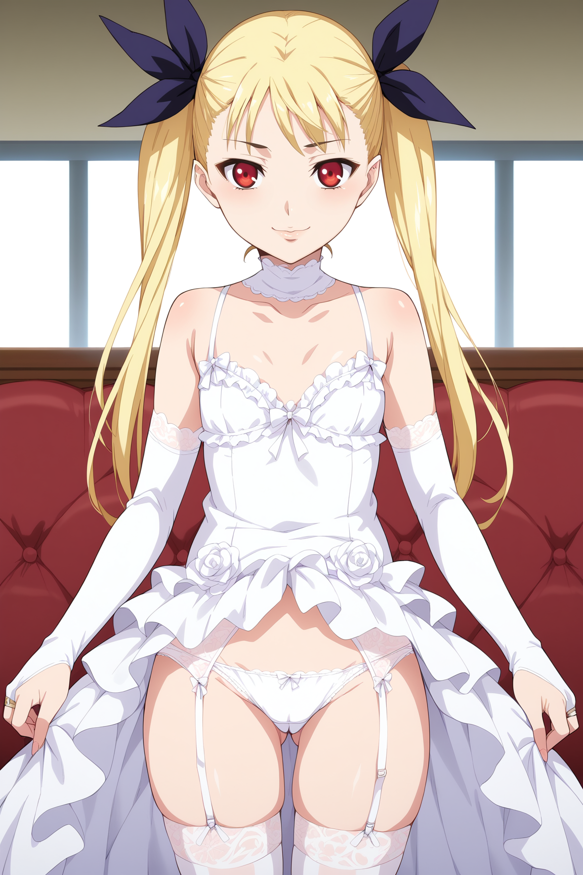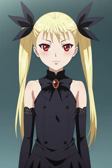 1girl, mina tepes, dance in the vampire bund, blonde hair, red eyes, twintails, hair ribbon, long hair, flat chest,