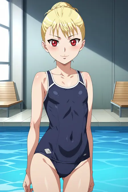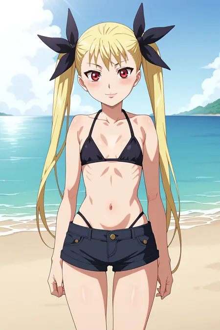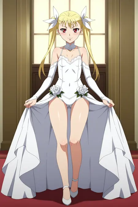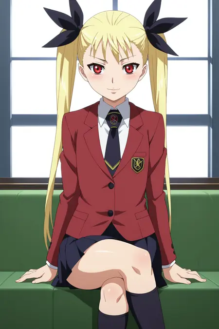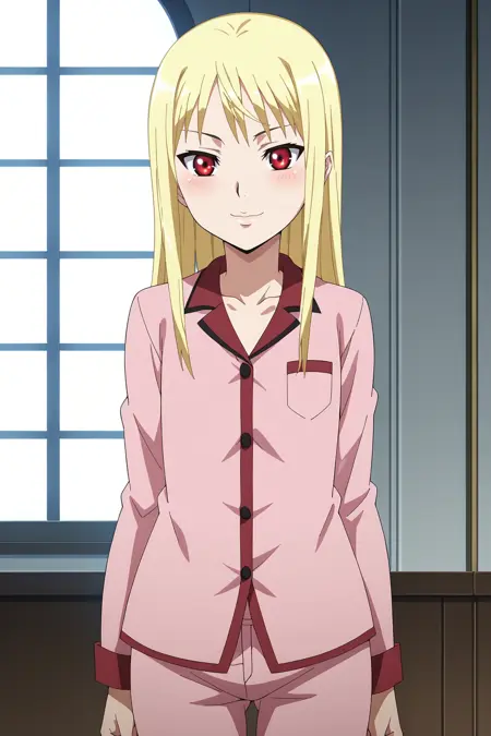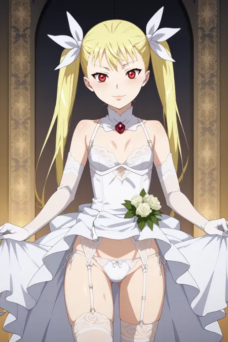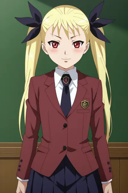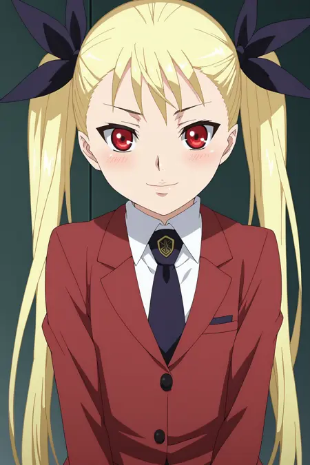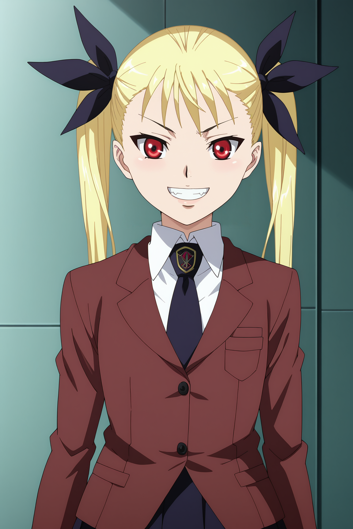 1girl, mina tepes, dance in the vampire bund, blonde hair, red eyes, twintails, hair ribbon, long hair, flat chest,