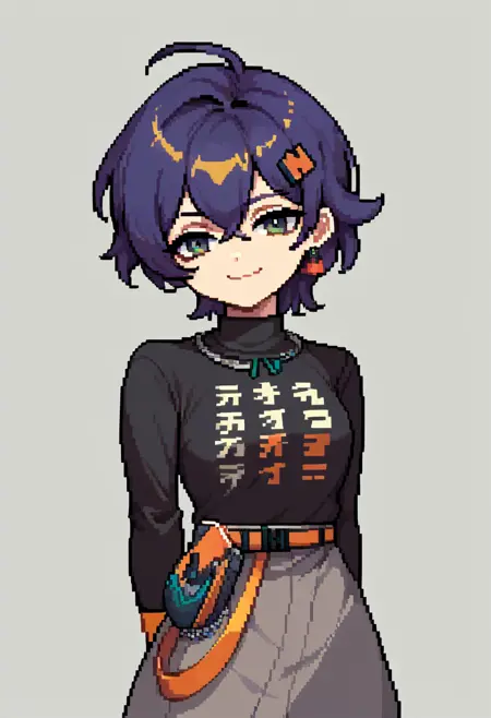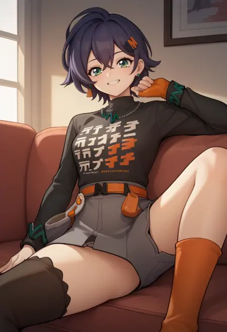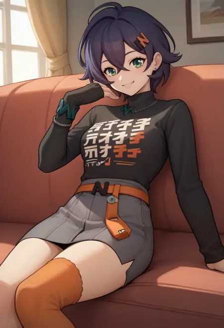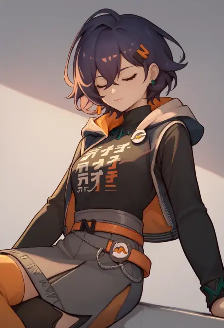 기본 옷차림(자켓 포함): 검은 셔츠, 긴 소매, 자켓, 후드, 맞지 않는 하의, 주황색 양말, 검은 허벅지 양말, 주황색 장갑, 손가락 없음 장갑, 회색 스커트, 벨트, 머리 장식, 보석