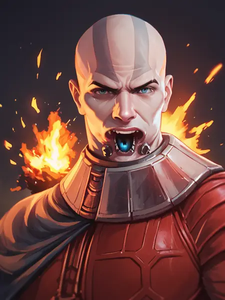 darthmalak, lower_jaw_missing, covered mouth, head tattoo, bald, red armor, cape