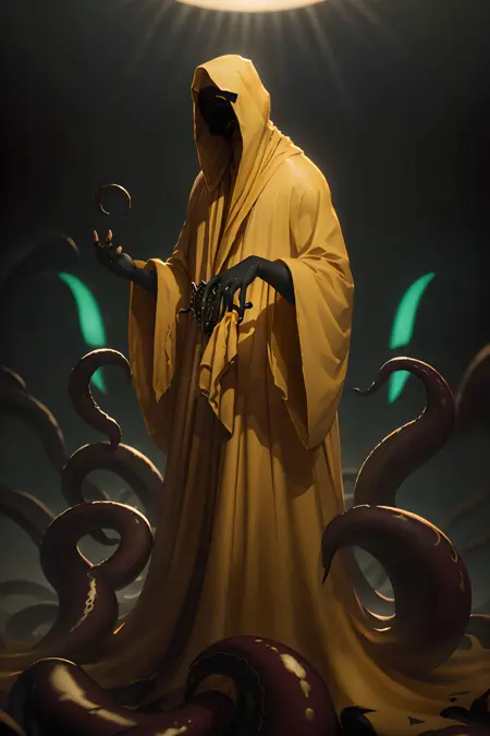 Hastur's alias is also called "The Unspeakable", "The King in Yellow", "The Feaster from Afar" or "The King of Stars in Deep Space". "Lord", in the system constructed by August William Dries for the myth of Cthulhu, Hastur is one of the old rulers, symbolizing the existence of wind and Cthulhu's existence symbolizing the existence of water. sworn enemy. He appears primarily as the "King in Yellow", a humanoid figure in yellow with a soft mask, and the "Distant Reveler", a wrinkled black figure with claws and tentacles. flying entity.