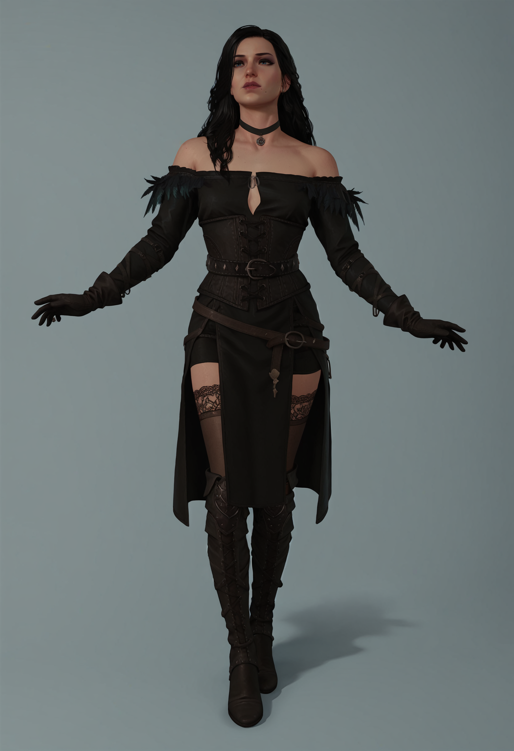 Use 3d, and/or render to make her look more like she does in the game or put in Negative for a drawn look.