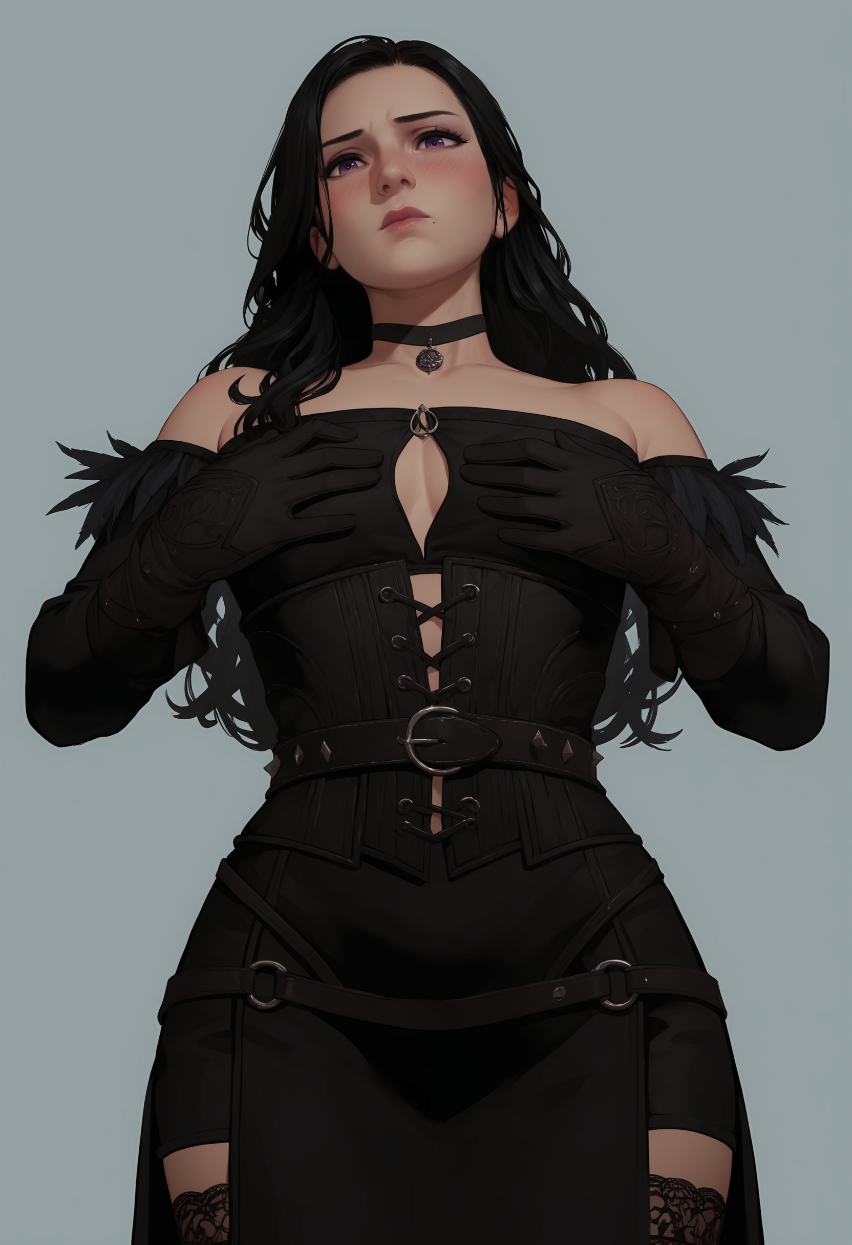 Optional tags: lips, violet eyes, belt, high heels