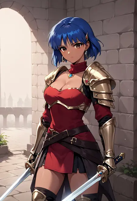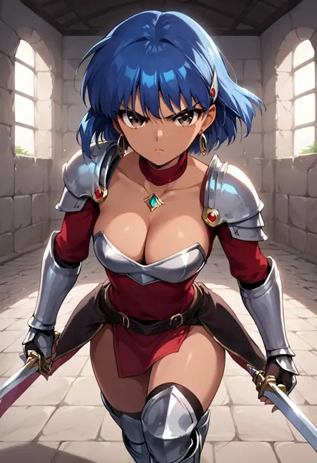 large breasts swords, weapon,leather armor,shoulder armor, jewelry, earrings, cleavage
