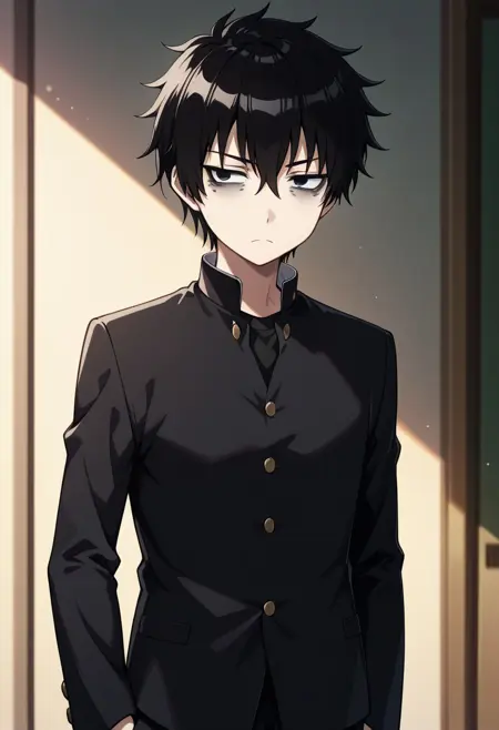 tomokikuroki, 1boy, male focus, solo, black eyes, bags under eyes, black hair, short hair, hair between eyes, school uniform, gakuran, jacket, black jacket, long sleeves, buttons, pants, black pants, shoes, sneakers