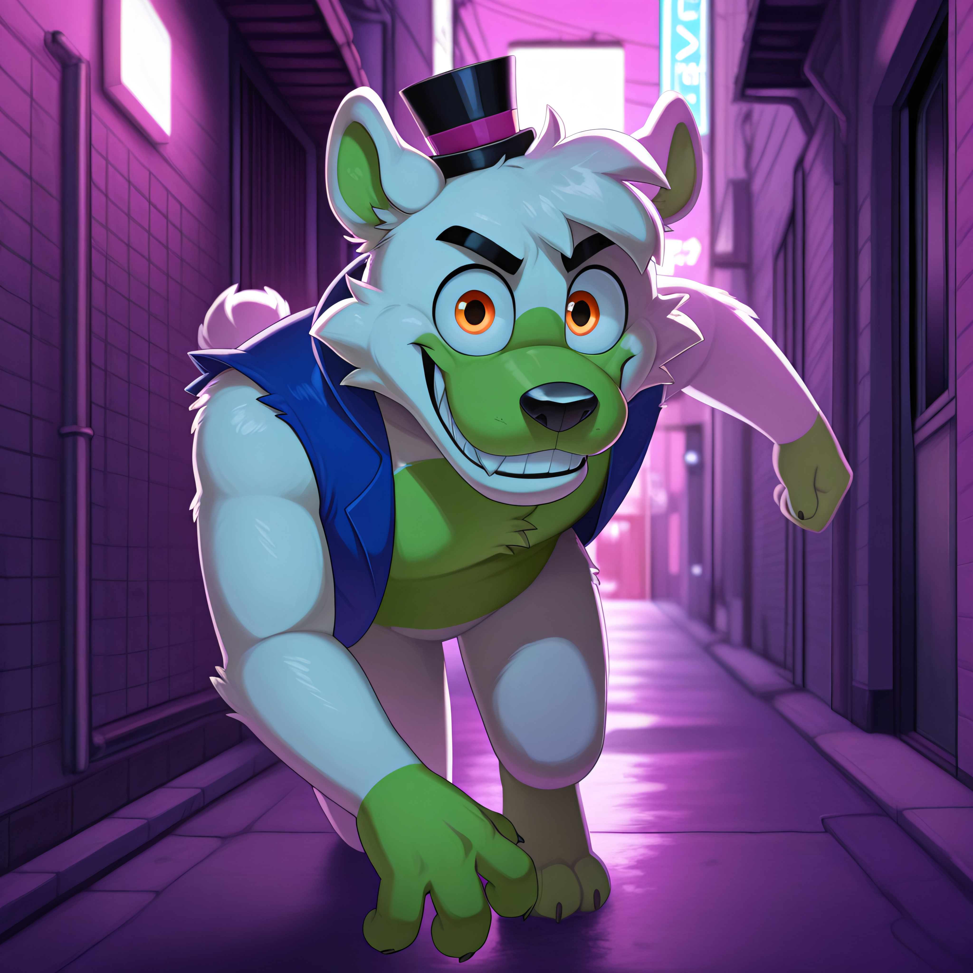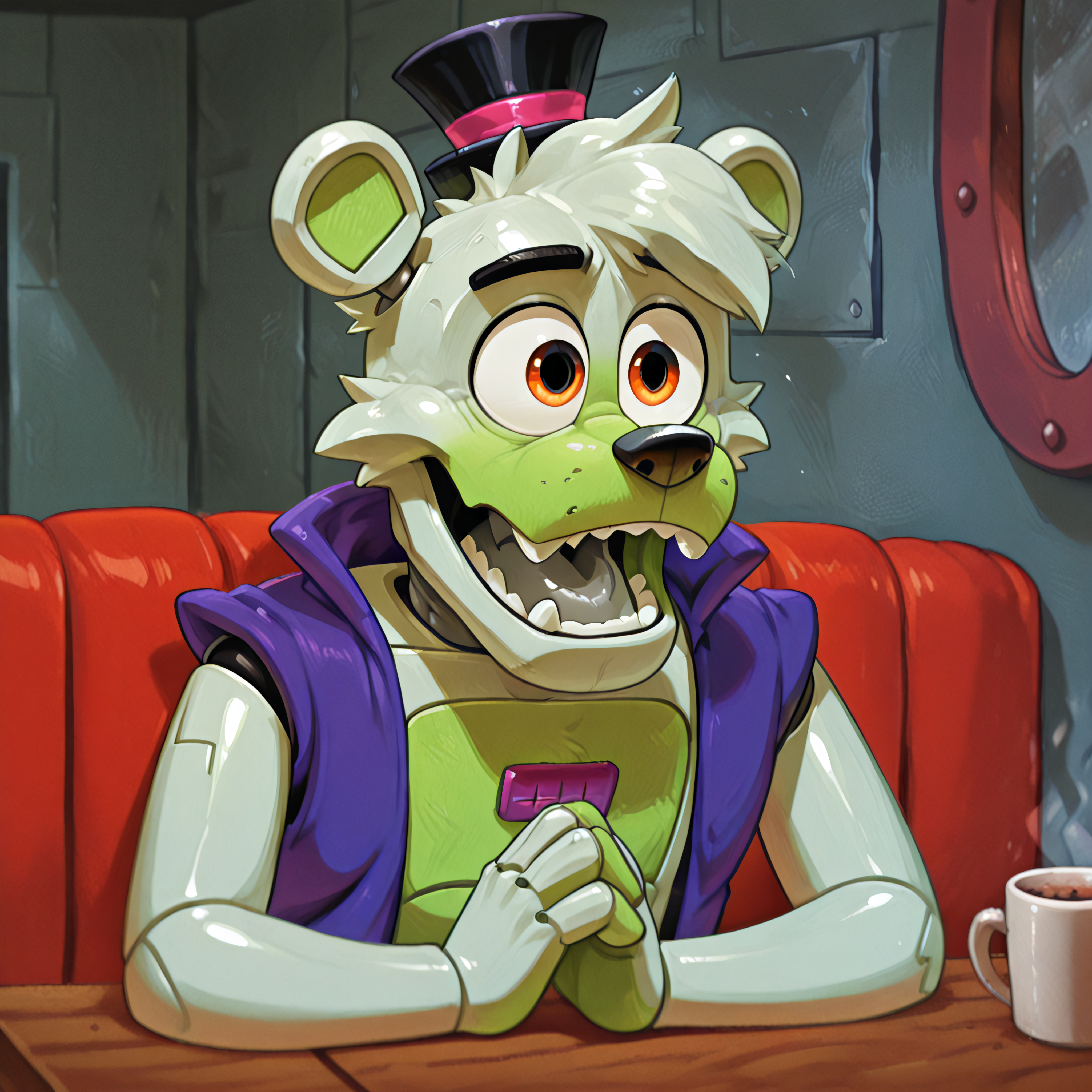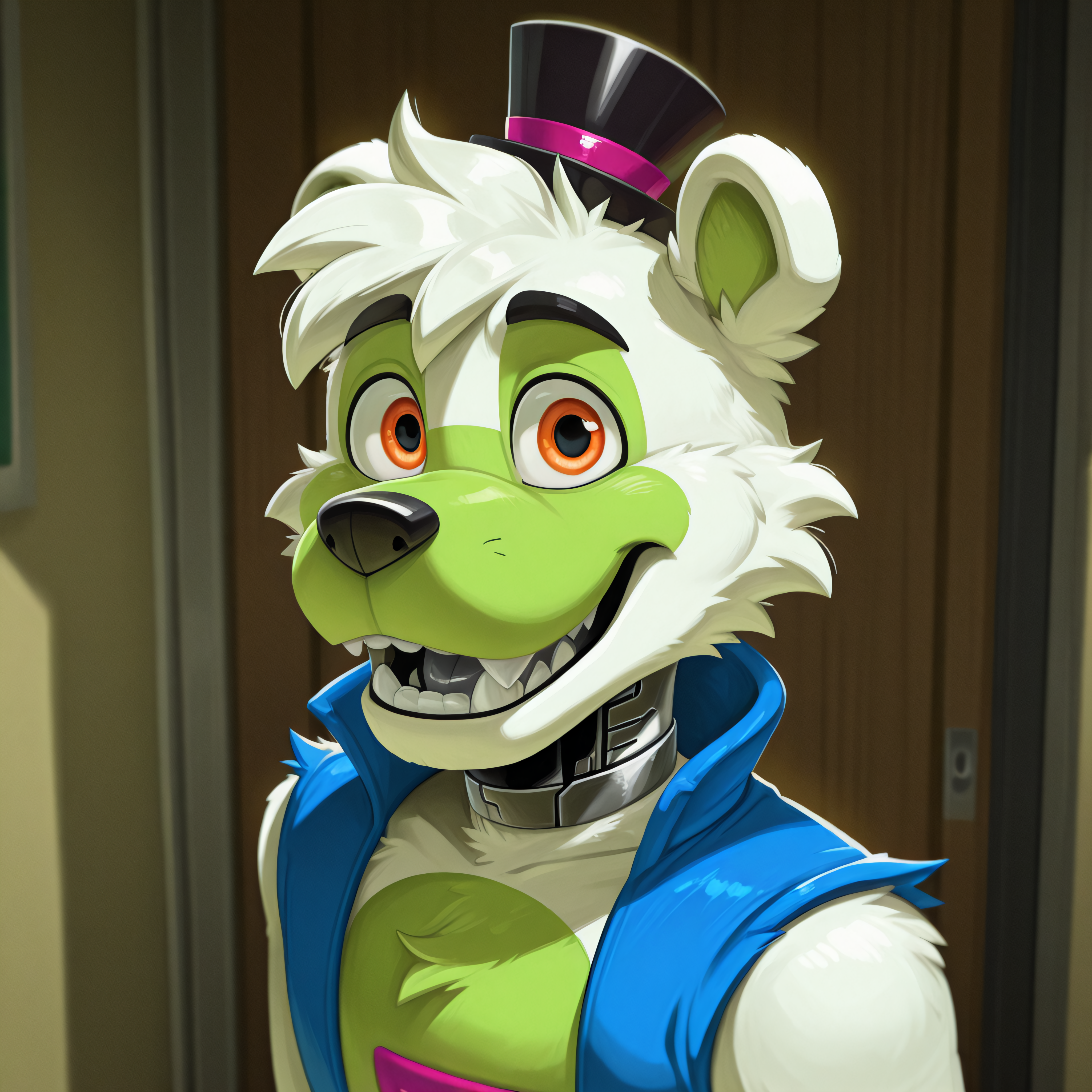 , saucebear, bear ears, large canines, perfect canines, sabertooth, deep blue mini top hat, bear ears, (bear ears), orange eyes, green falangs, three green fingers, (three green fingers), greenish-white body:1.7" If you want a furry, you don't have to use the "metallic neck" if you want a robot, it's the opposite, in fact this LoRA is very versatile.