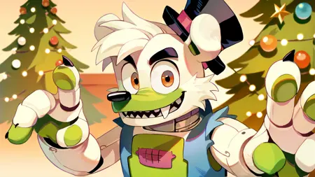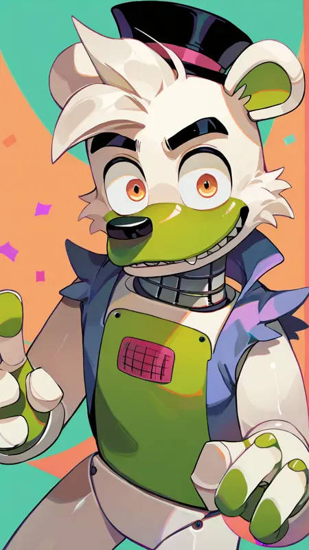 "score_9_up, score_8_up, score_7_up, source_furry, <추가 LoRA 트리거>, saucebear, bear ears, large canines, perfect canines, sabertooth, deep blue mini top hat, bear ears, (bear ears), orange eyes, green falangs, three green fingers, (three green fingers), greenish-white body:1.7"