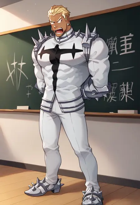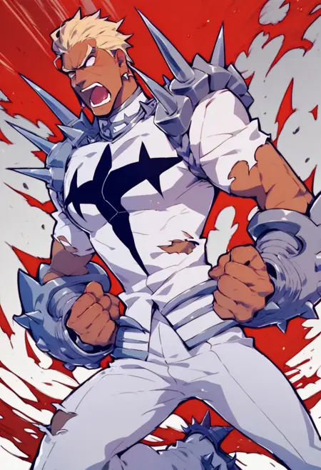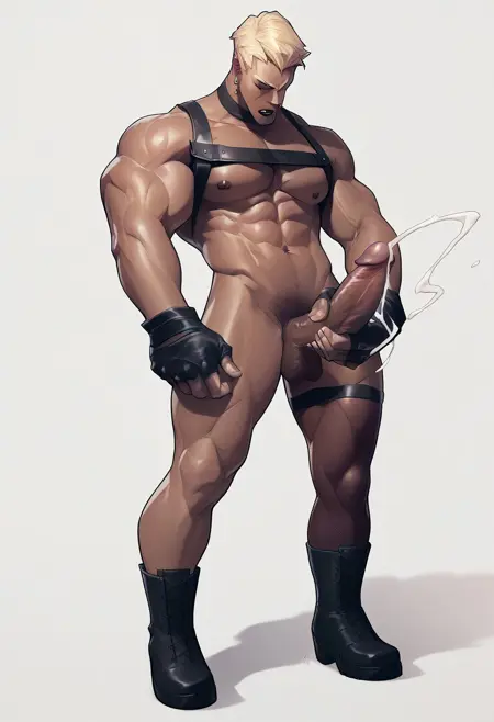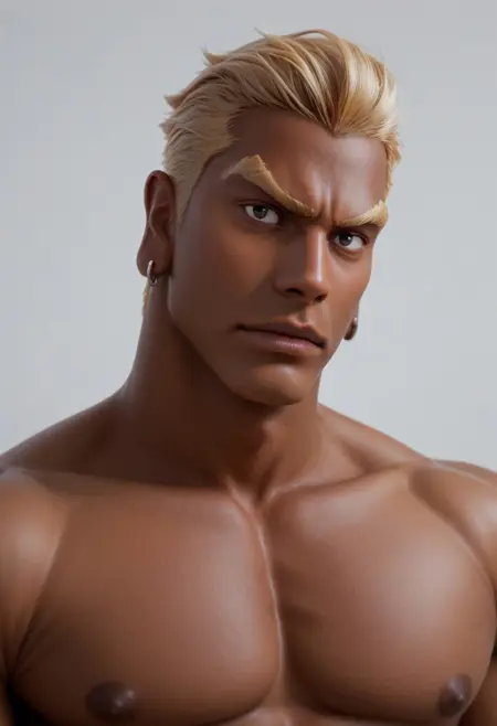 gamagori_ira, bara, blonde hair, dark skin, short hair slicked back, earrings, muscular,
