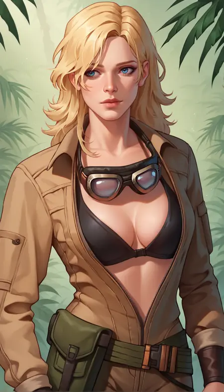 3vamgs3, 1girl, blonde hair, jumpsuit, goggles around neck