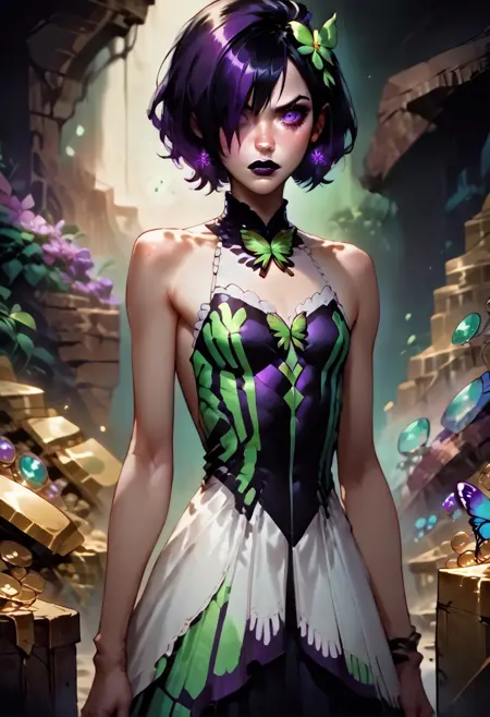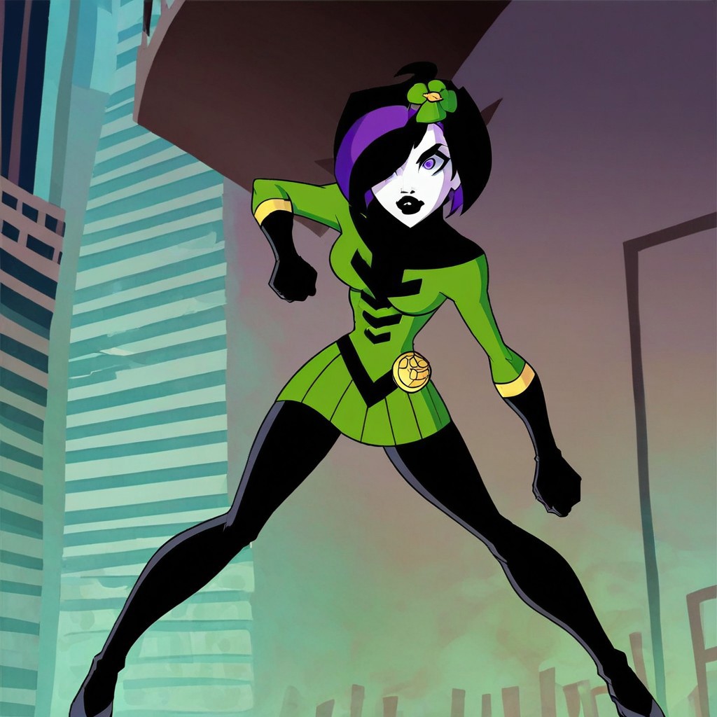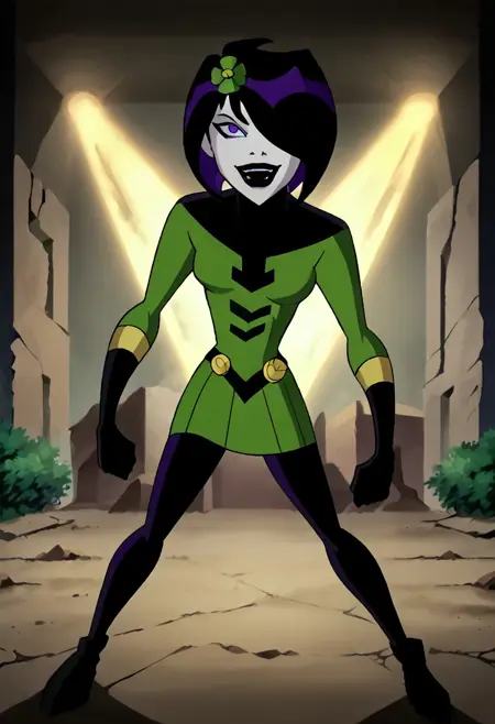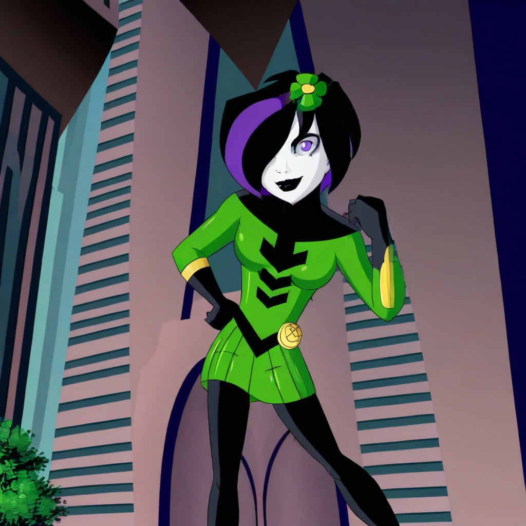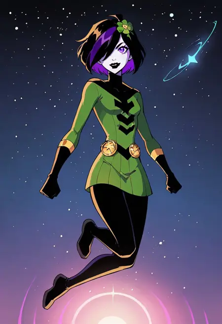 我用于准确还原角色、尝试不同风格/基础时的通用提示词:西方卡通风格,黑色腰带,黑色口红,黑色手套,紫色眼睛,黑色头发,发丝中带有深紫色条纹,头发遮住一只眼睛,中等长度鲍勃头,白皙肤色,黑色紧身裤,腰带上金色圆环,头发上佩戴绿色花朵,绿色连衣裙。