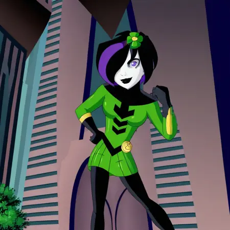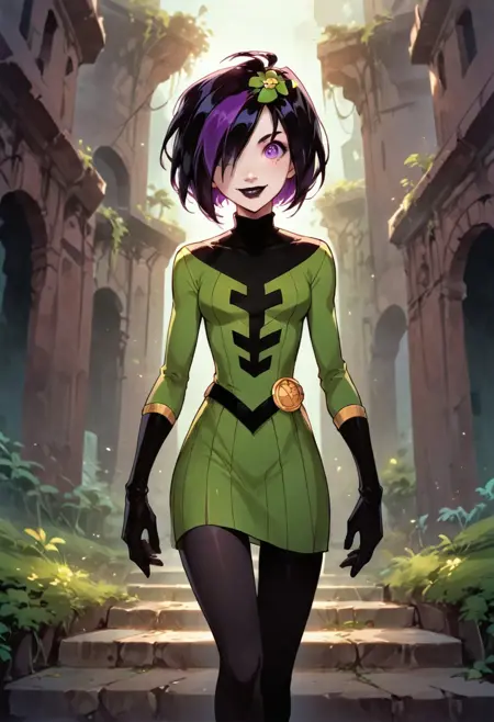 異なるスタイルやベースで正確な描写を試す際に使用した一般的なプロンプト:ウェスタンカートーン、黒いベルト、黒いリップ、黒い手袋、紫色の目、黒い髪、髪に濃い紫のストライプ、片方の目を髪が隠している、ミディアムボブ、白い肌、黒いレギンス、ベルトの金の円、髪に緑の花、緑のドレス。