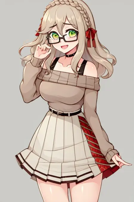 Reneecrushcrush, 1girl, solo, glasses, green eyes, braid, breasts, skirt, sweater, off-shoulder sweater, long hair,