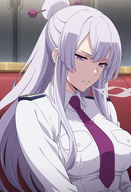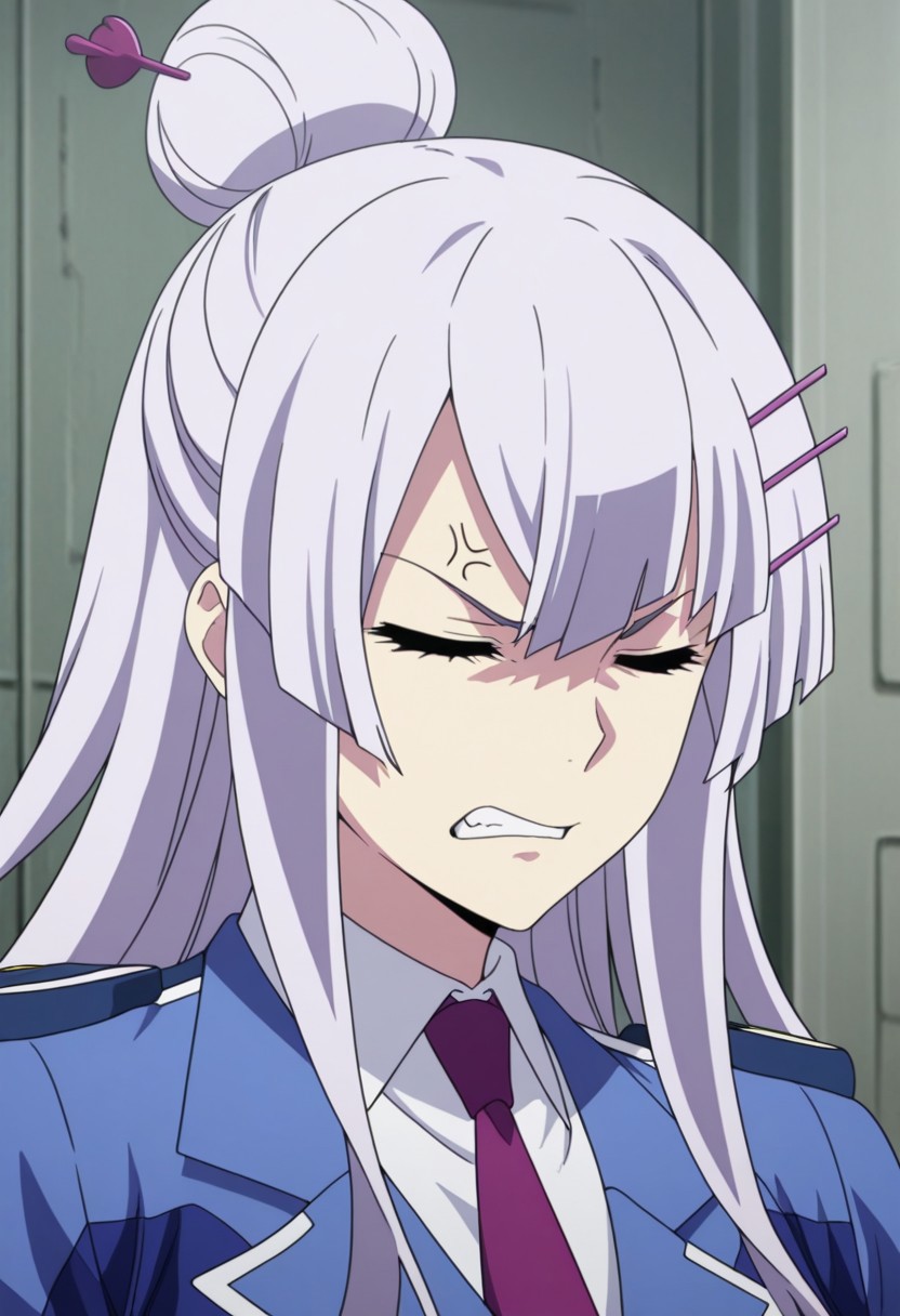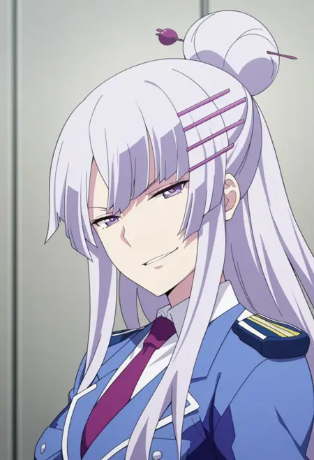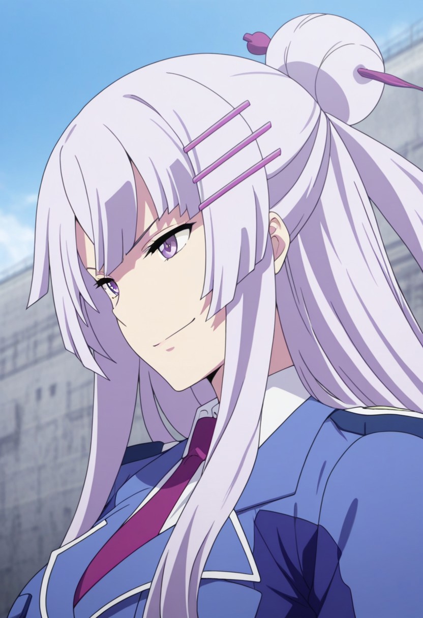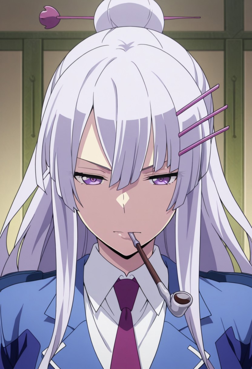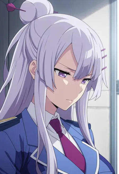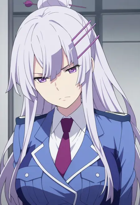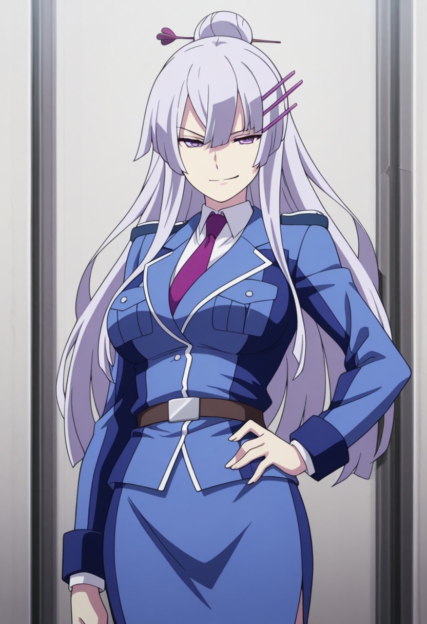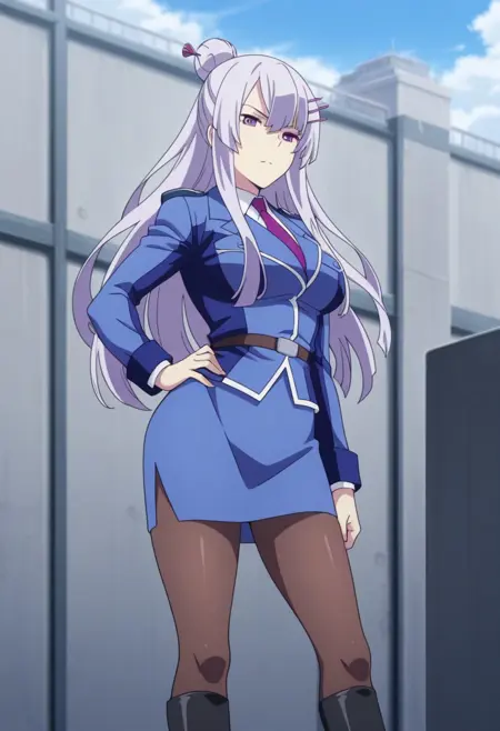 Froleytia, 1girl, solo, 보라색 눈, 보라색 머리, 긴 머리, 머리 장식, 단일 머리 뾰족이, 머리 막대기, 유니폼, 셔츠, 흰색 셔츠, 칼라 셔츠, 넥타이, 보라색 넥타이, 재킷, 파란색 재킷, 벨트, 치마, 파란색 치마, 갈색 팬티하이즈, 무릎 부츠, 검정 신발,