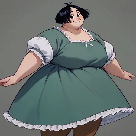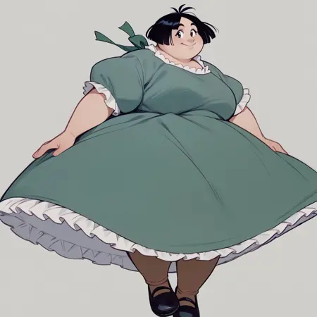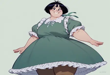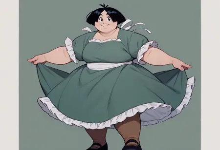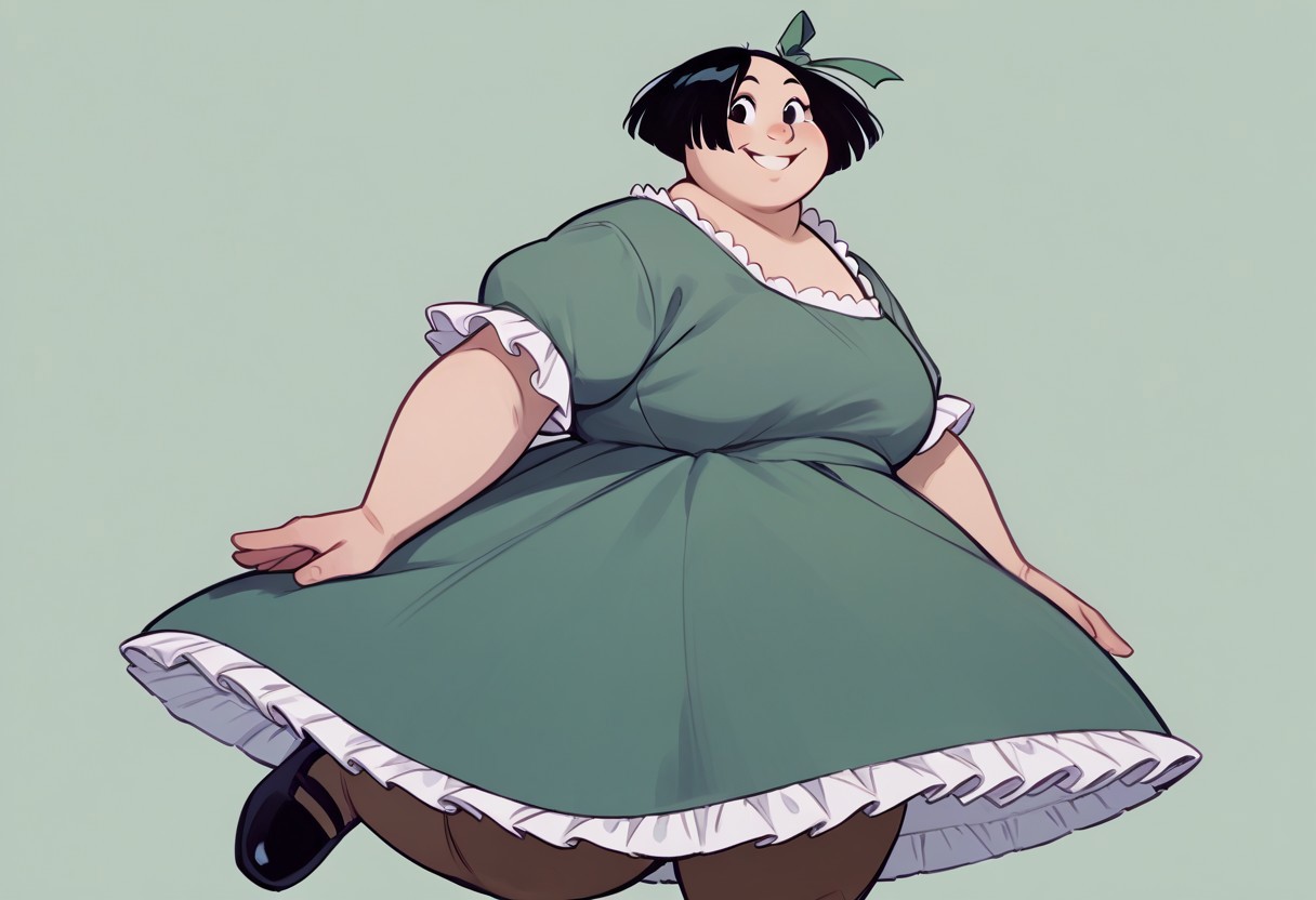 short-sleeved cleavaged green dress, short frilly white sleeves, light green back dress ribbon