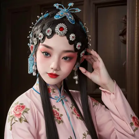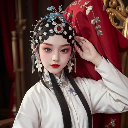 **旦角**则扮演女性角色,包括贵妇、妃子和少女。旦角通过细腻的表情和柔美的舞姿展现女性的温婉和柔情。
