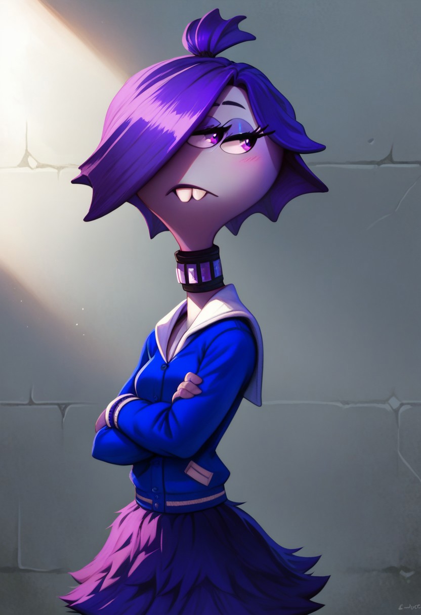 clairew, monster girl, purple eyes, grey skin, buck teeth, purple hair, hair covering one eye, half-closed eyes, chocker, blue jacket, letterman jacket, purple skirt, short tail