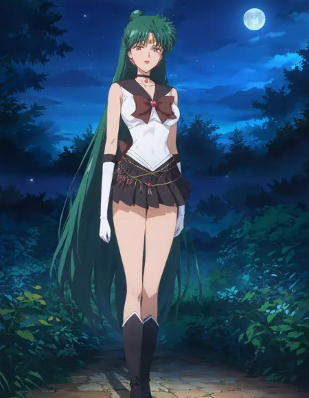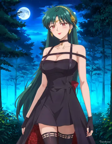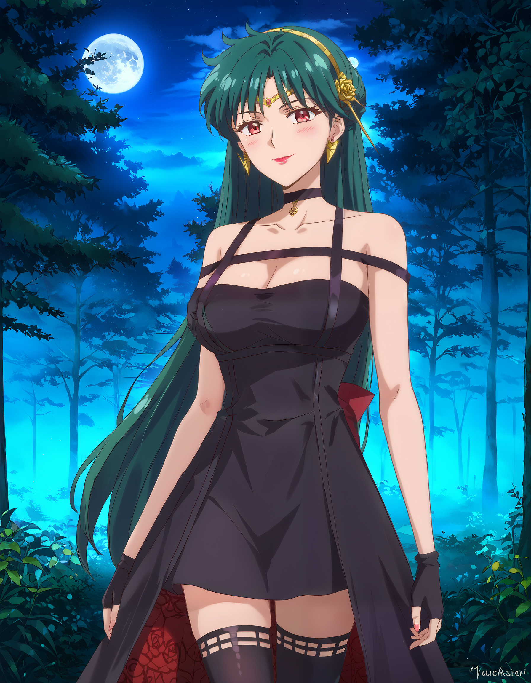 Character: 1girl, SailorPluto, green hair, long hair, hair bun, red eyes, lipstick, jewelry, tiara, choker, black choker, big breast,