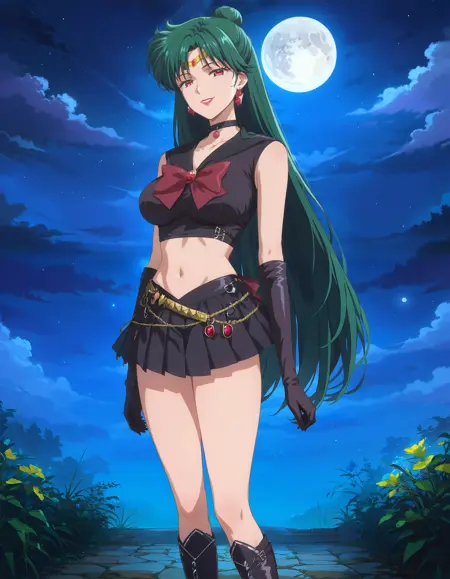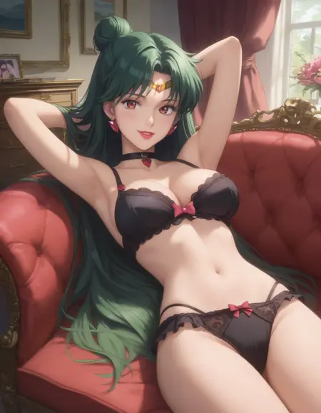 角色:1girl, SailorPluto, 绿发, 长发, 发髻, 红眼, 唇膏, 珠宝, 王冠, 项圈, 黑色项圈, 大乳房,