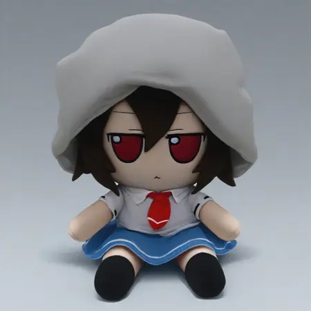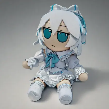 toys_mikus, fumo style, fumo, full body, white background, sitting