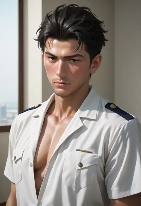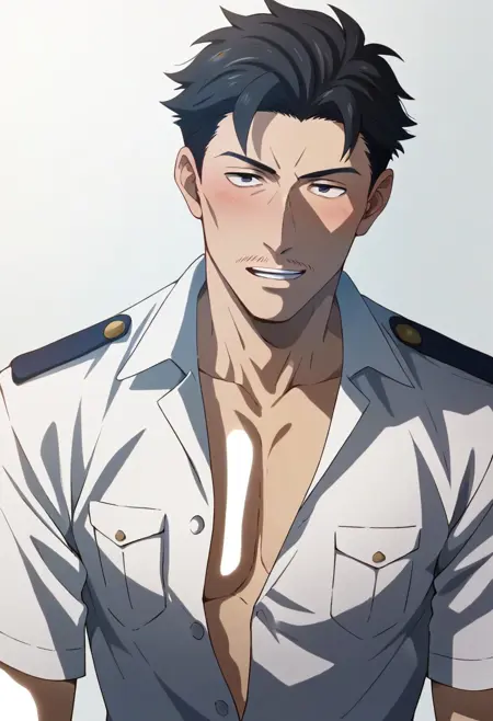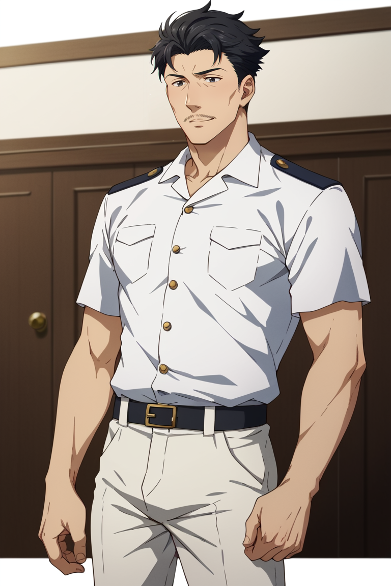 프롬프트: Ichiro Satomi, 검은 머리, 단발, 검은 눈, sapaku, (면적, 가벼운 콧수염 자국, 얇아진 콧수염 자국:1.3), 군복, 흰 셔츠, 단기 sleeves, 계급 표시, 카키 바지, 검은 양말, 검은 신발