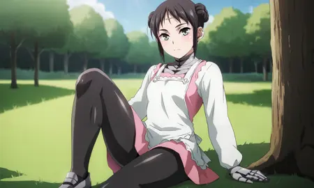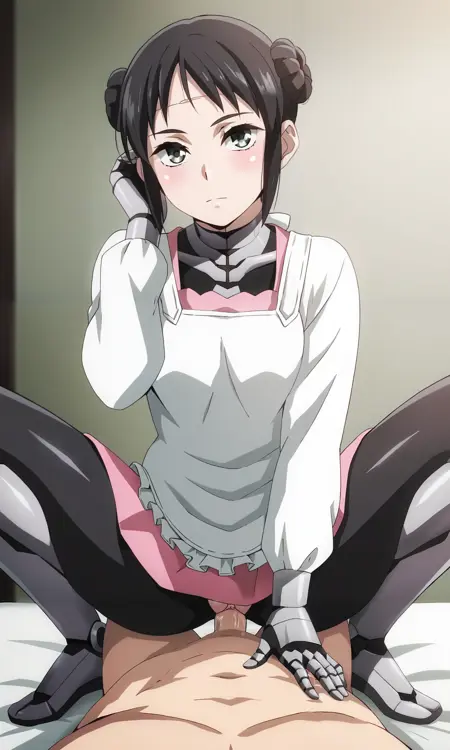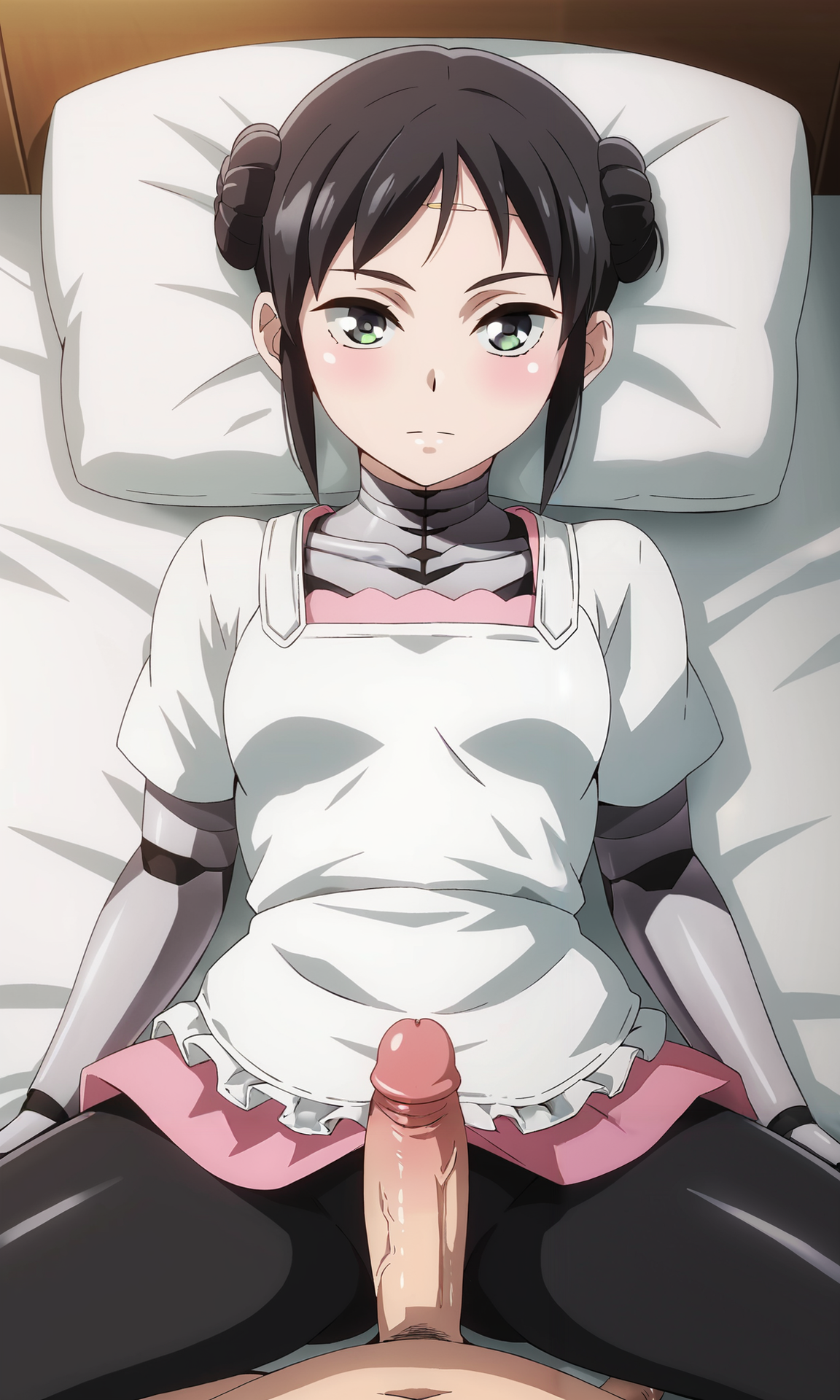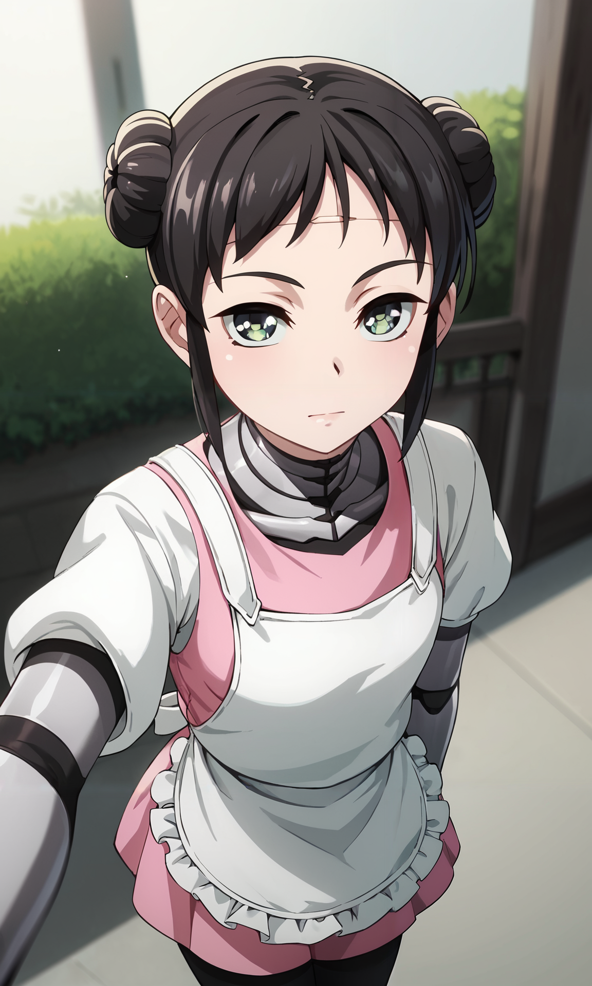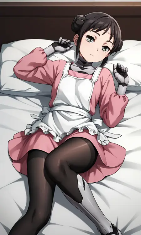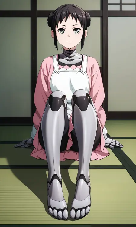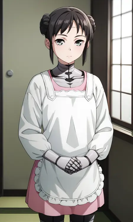 mina_wz, green eyes, eyelashes, black hair, double bun, hair bun, short hair, sidelocks, closed mouth, expressionless, android, pink dress, apron, white kappougi, black pantyhose, robot, mechanical parts, mechanical arms, mechanical legs