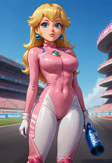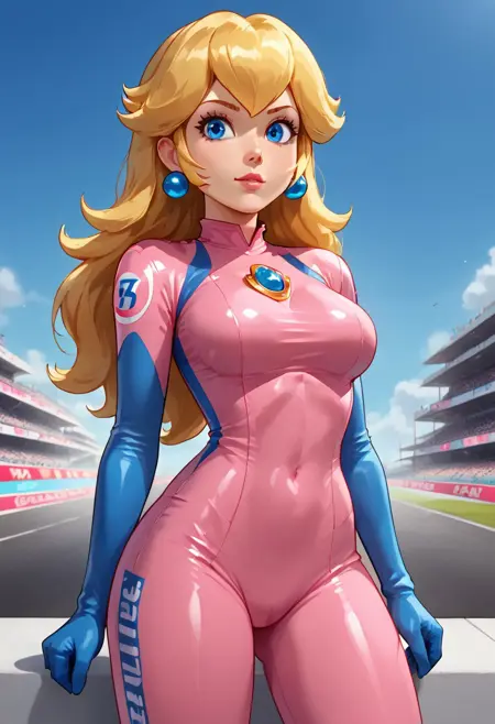 金髪、肩までの髪、ウェーブのかかった髪、顔周りの髪、明るい肌、青い瞳、白い細部が入ったピンクのタイトなレーシングスーツ、ピンクのレーシンググローブ、高めのピンクのレーシングブーツ、胸元の青い宝石のブローチ、青いイヤリング、青い宝石