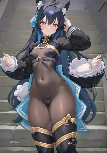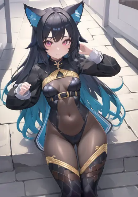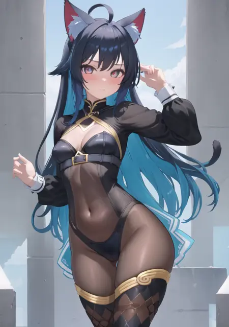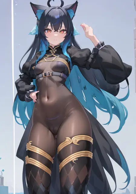"1girl, black body stocking, cat ears, cat tail, svartlija, blue hair, wide hips, small breasts, solo, solo focus,"