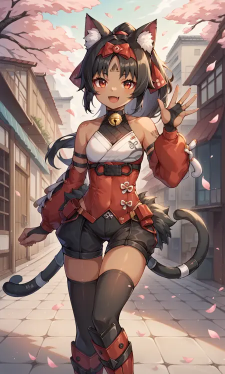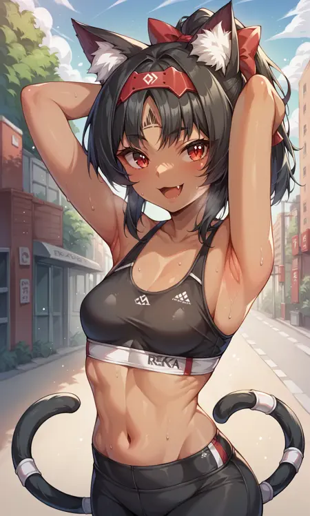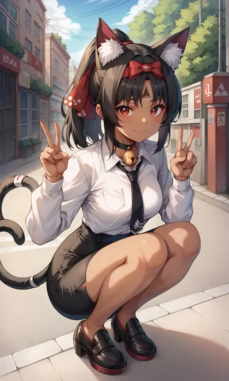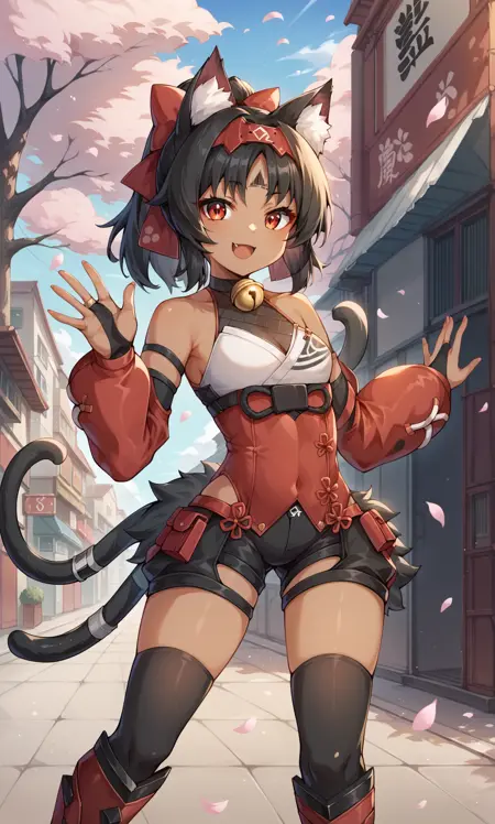 외모: 네코미야, 빨간 눈, 검은 머리카락, 짙은 피부, 머리카락 꼬리, 고양이 귀, 고양이 꼬리, 두 개의 꼬리, 헤어밴드, 빨간 리본, 머리 리본, 이마 마크