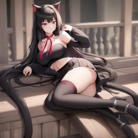 1girl, curvy, medium breasts, cat ears, cat tail, red eyes, slitted eyes, solo, solo focus, red ribbon choker, midriff, thigh highs, detached sleeves, long sleeves, bare shoulders, wide hips