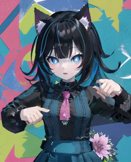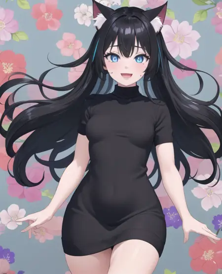 1girl, adult, small breasts, cat ears, cat tail, blue eyes, black hair,