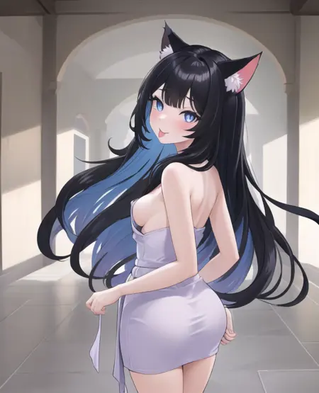 "1girl, adult, small breasts, cat ears, cat tail, blue eyes, black hair,"