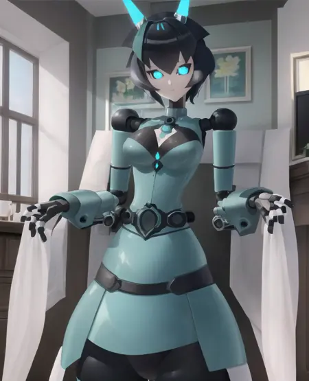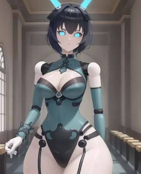1. "1girl, yogurt cap, robot joints, android, glowing eyes, blue eyes, wide hips, Short hair, black hair, robot hands,"
