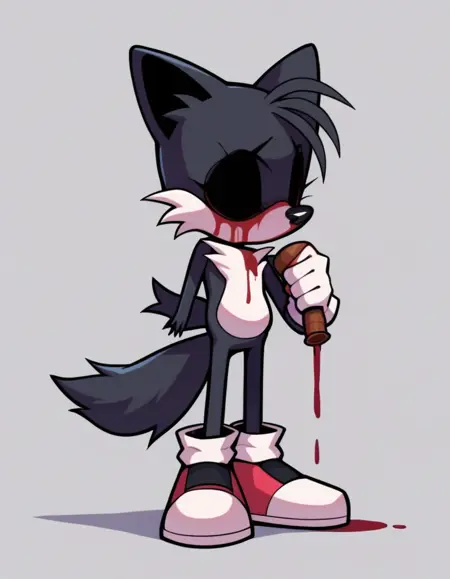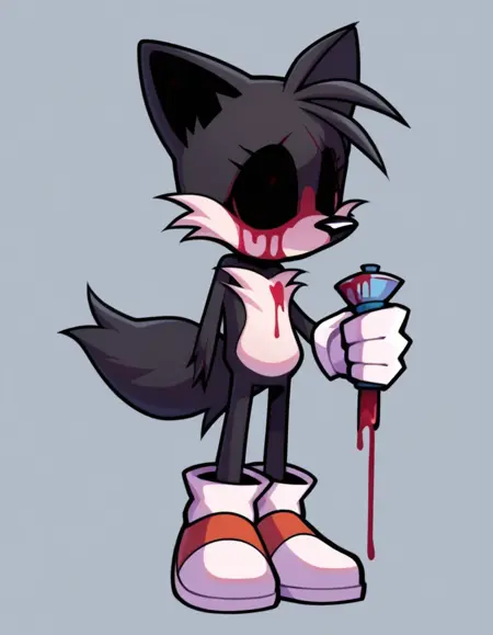 Soul_TailsEXE, grey hair, gloves, 1boy, animal ears, tail, shoes, white gloves, blood, furry, blood on face, furry male, body fur, white fur, animal nose, two-tone fur, bleeding, black fur, blood from eyes, anthropomorphic fox with a dark color palette, eerie appearance, right arm still has hand