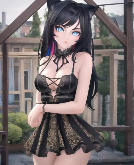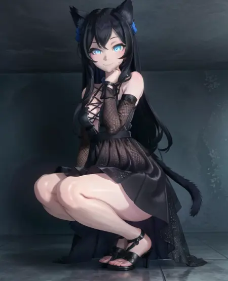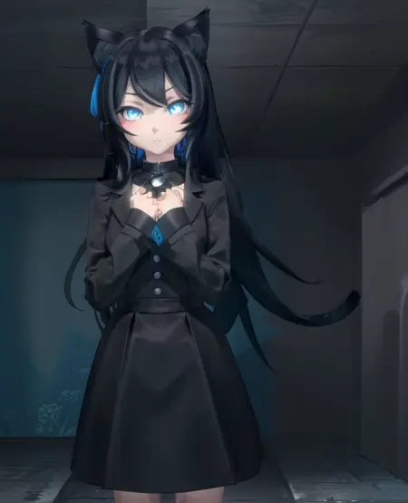 - "1girl, oathmeal, 고양이 귀, 고양이 꼬리, 파란 눈, 검은 꼬리, 검은 드레스,"