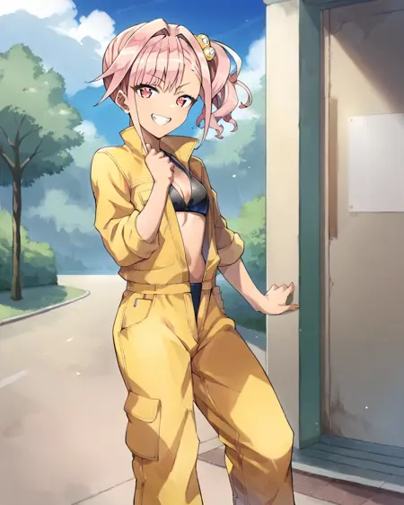 노란 점프수트, 검은 장갑, 손가락 없음 장갑, 갈색 신발