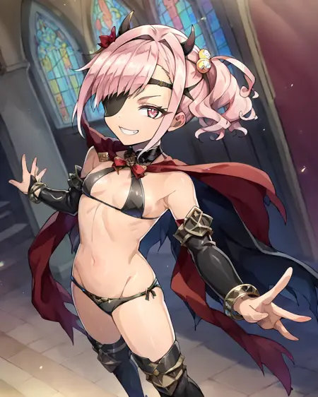 검은 비키니, 마이크로 비키니, 팔꿈치 장갑, 보석, 팔찌, 안대, 검은 허벅지 부츠, 헬터넥, 하이힐 부츠, 빨간 리본, 가짜 뿔, 리본, 양면 망토, 빨간 망토, 검은 망토