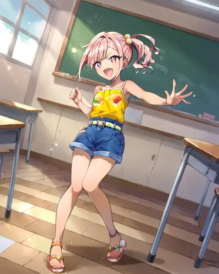 노란 캐미솔, 과일 프린트 캐미솔, 흰색 벨트, 파란 반바지, 데님 반바지, 주황색 샌들