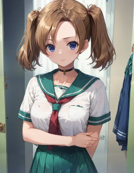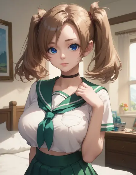 Sayaka, blue eyes, brown hair, twin pigtails, big breast, black choker