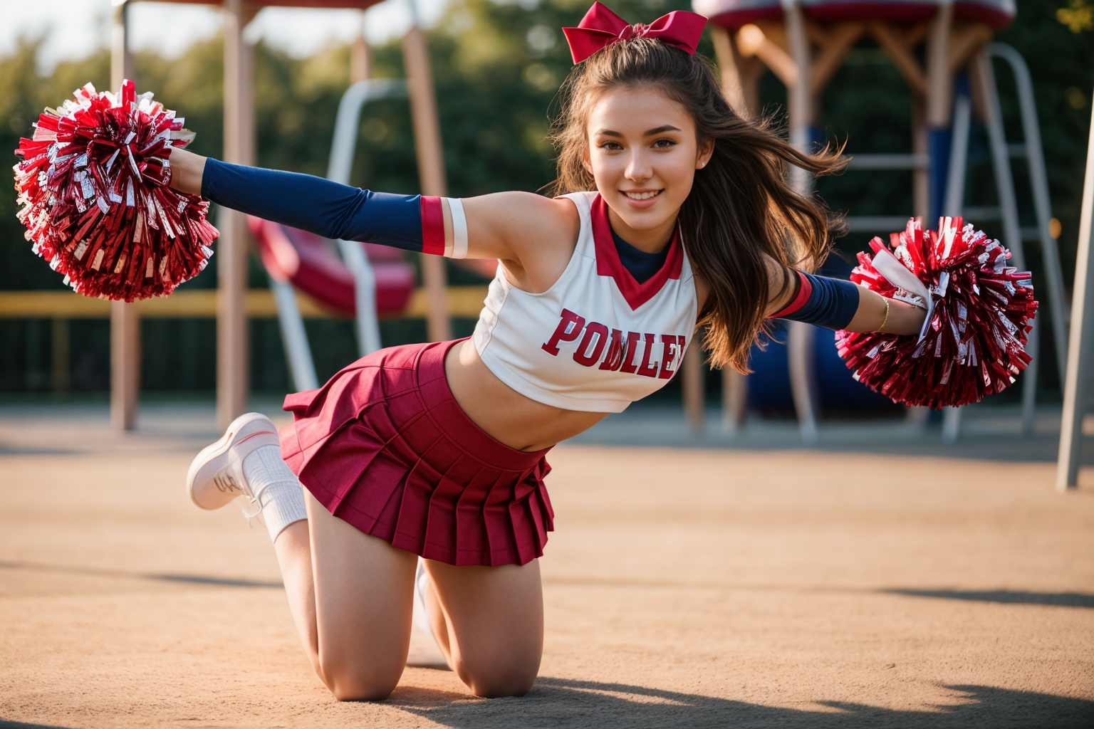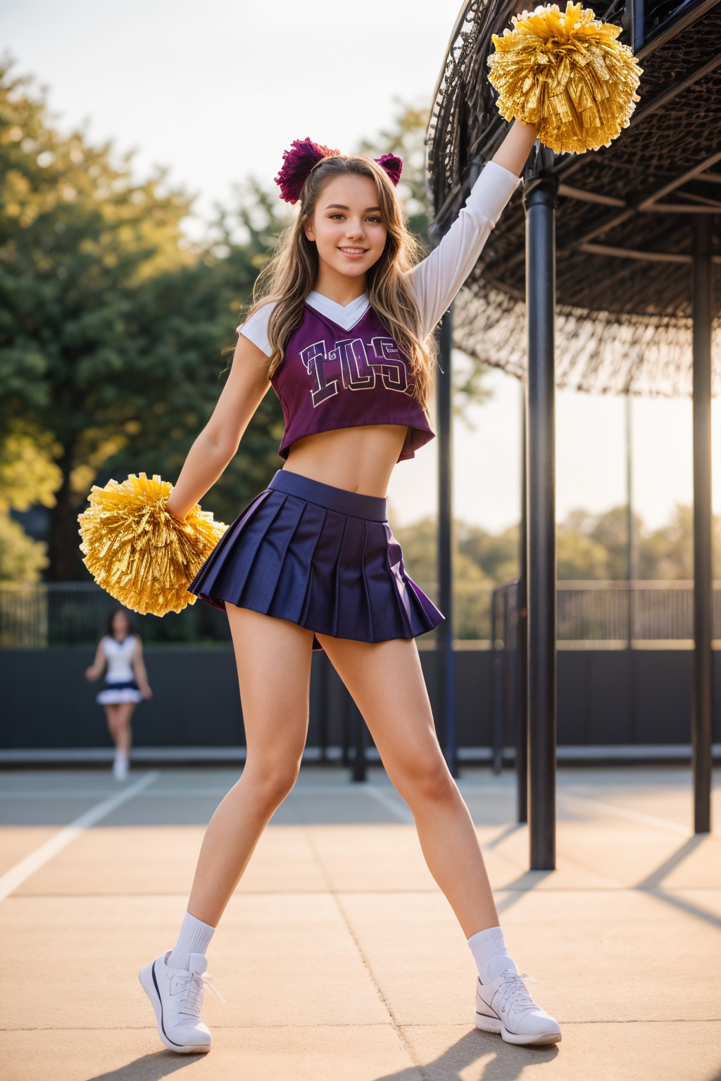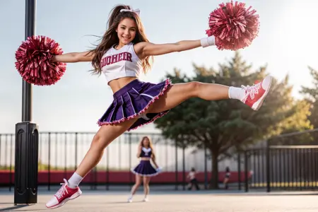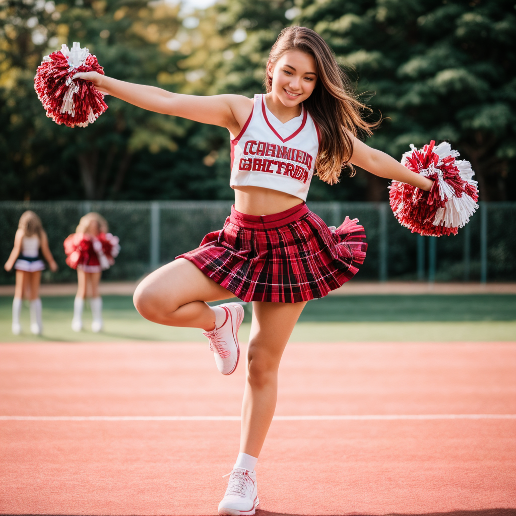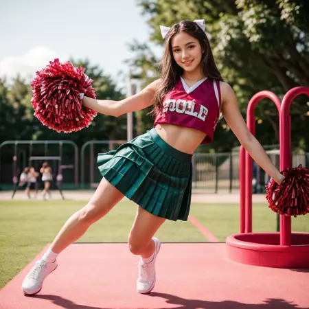 プロンプト: チアリーダー、ポンポン \(チアリーディング\)、クロップトップ、プリーツスカート、