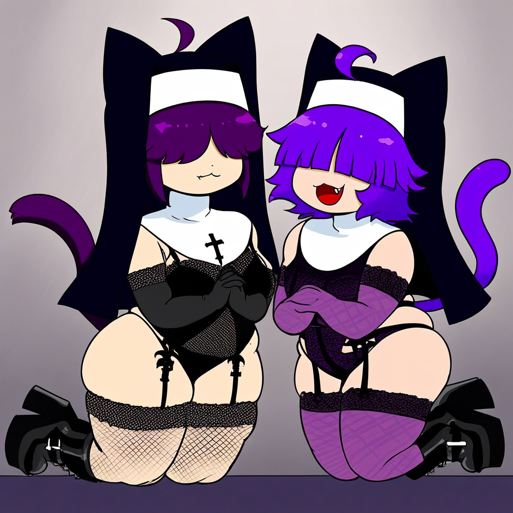 nun, black lingerie, fishnets, lace-trimmed legwear, platform boots, veil, elbow long black gloves, black chocker
